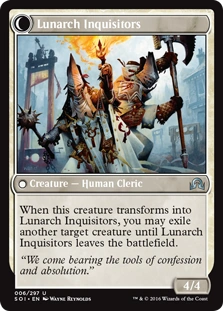 | Oracle Text: | When this creature transforms into Lunarch Inquisitors, you may exile another target creature until Lunarch Inquisitors leaves the battlefield. | |