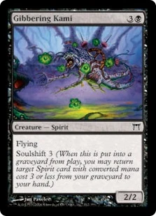 Amber controls a Gibbering Kami and has a Wandering Ones and a Kami of Old Stone in her graveyard. When Gibbering Kami its soulshift 3 will trigger, this means that he can bring back the Wandering Ones, as it has a CMC of 1, but not the Kami of Old Stone, as it has a CMC of 4, which is higher than the max of three. It also can't bring itself back.